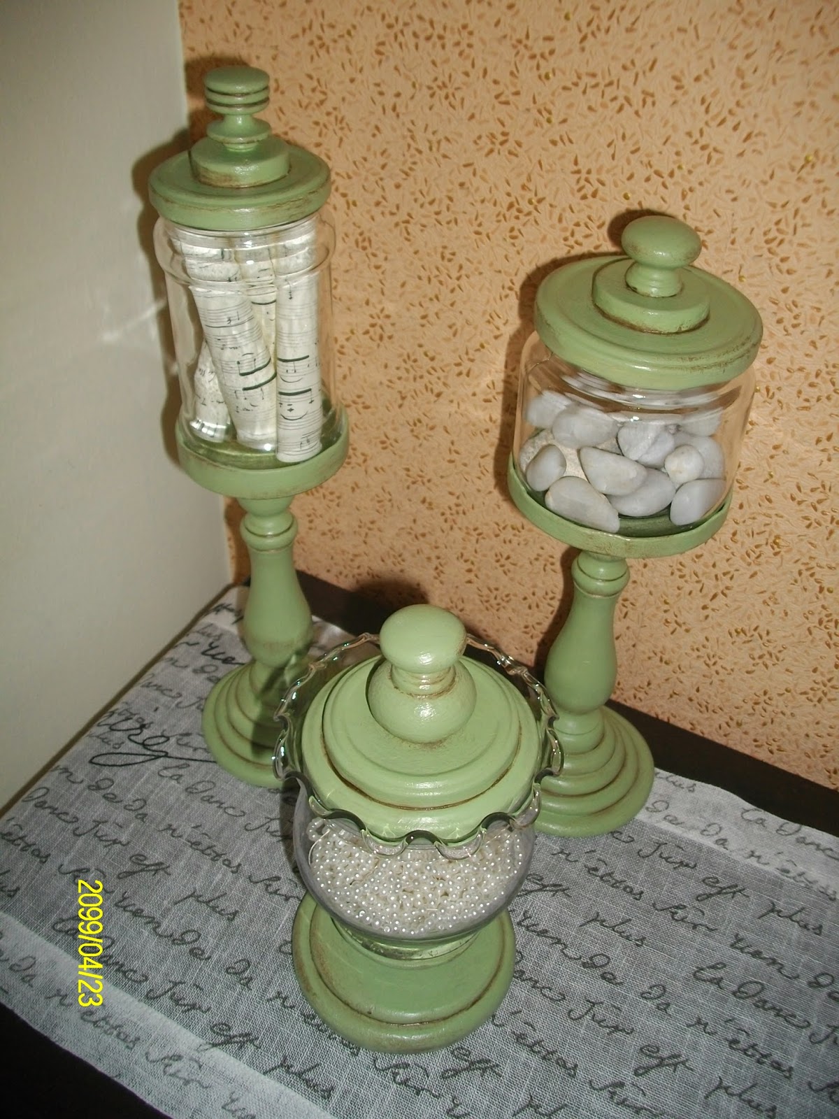 Αφού στέγνωσαν καλά όλα τα υλικά (κόλλα ,στόκος,primer) βάψαμε όλα τα κομμάτια(τα καπάκια μόνο εξωτερικά) με ριπολίνη νερού.Περάσαμε λίγη μπρονζέ πατίνα και τα περάσαμε μία φορά με βερνίκι ,κολλήσαμε με κόλλα δυνατή τα βάζα στις βάσεις και...έτοιμα!Τα στολίσαμε και πήραν τη θέση τους για φωτογράφιση!